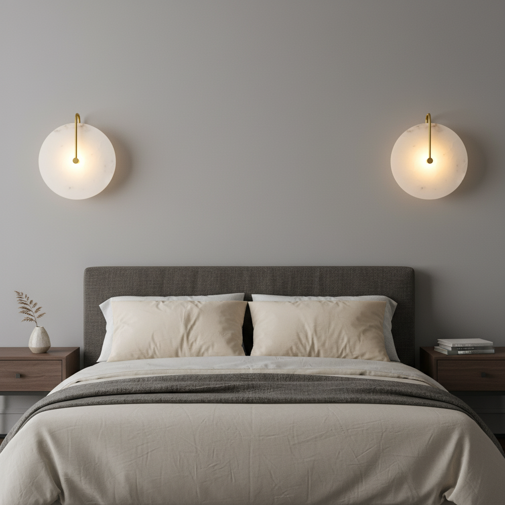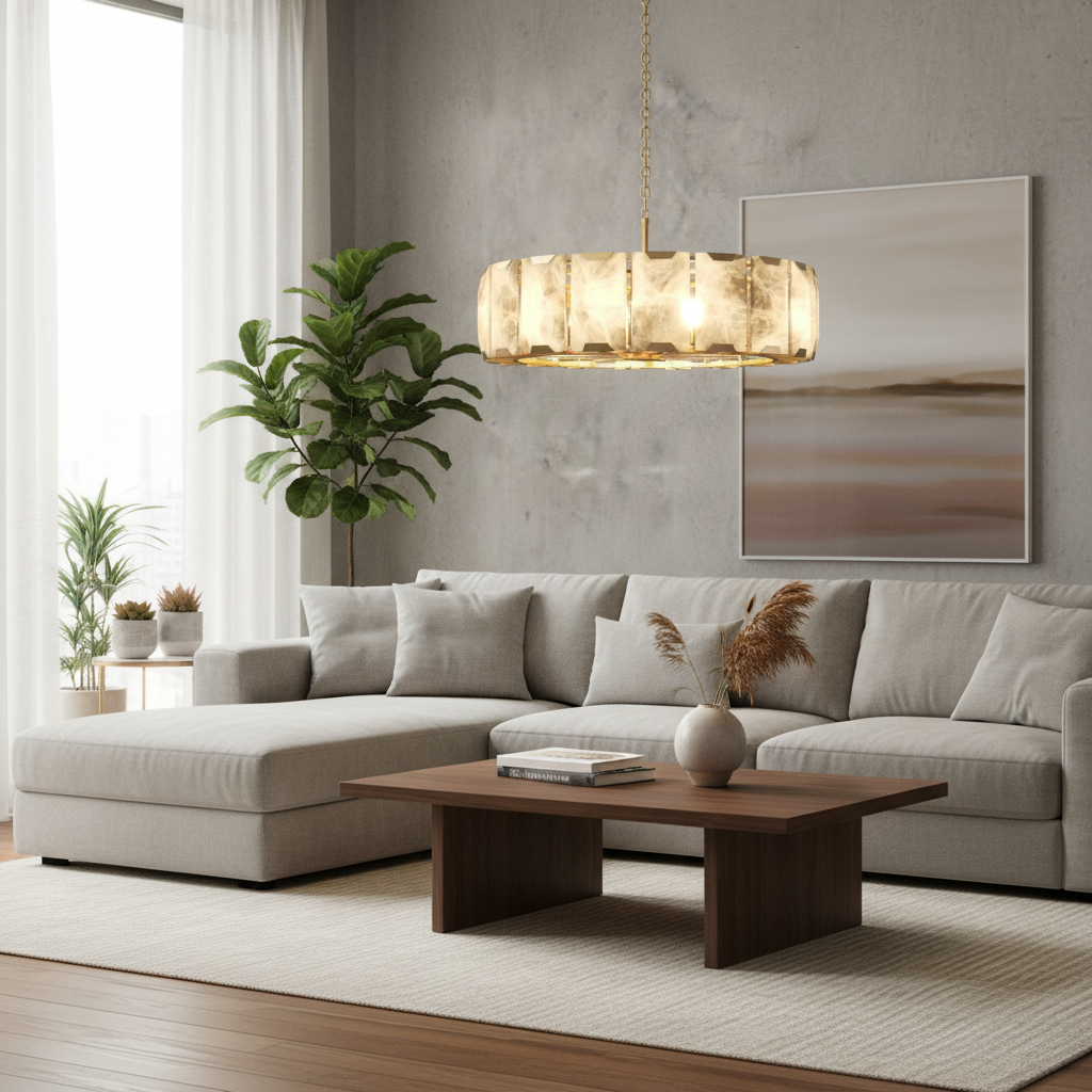 This alabaster pendant lamp features natural stone texture and soft light transmission. It creates a warm, calm atmosphere and adds an elegant, minimalist touch to your dining room, bedroom or living space.
